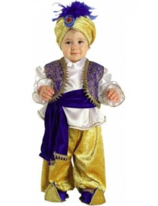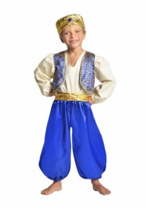 Mettez aussi votre bébé dans le bain des fêtes déguisées en lui faisant enfiler cette tenue de déguisement Aladin. Dans cette dernière, votre enfant ne manquera pas de faire très belle impression. C’est une combinaison blanche zippée à l’entrejambe et ceinturée d’un foulard en suédine bleu. La fermeture zippée dans l’entrejambe est une idée ingénieuse du fabricant afin de vous faciliter le changement de couches. Le look de votre enfant sera ainsi rehaussé par gilet en velours bleu aux imprimés chatoyants et un turban doré incrusté de pierres et de plumes. Pour couronner le tout, enfilez les sur-babouches assorties à la tenue à votre bébé et il est tout prêt pour la fête. Seulement, notez que cette tenue coûte très cher, bien plus cher même que certains déguisements pour adulte.