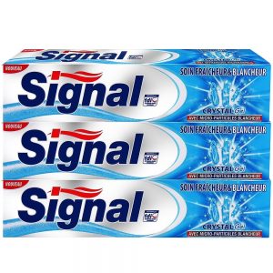 La marque Signal vous propose son lot de 3 dentifrices à un prix unique, disponible en ligne. Cette marque est célèbre mondialement dans la fabrication de pâte à dentifrice. Dans ce cas, presque tous les habitants dans le monde l’utilisent et trouvent des effets bénéfiques pour la santé de leurs dents. En effet, ce dentifrice est composé d’un gel de menthe frais qui, évidemment, apporte de la fraîcheur dans votre bouche. En plus, ce produit possède une caractéristique qui blanchit vos dents et rend votre sourire éclaircissant. À titre de conseil, il vaut mieux se brosser les dents après chaque repas avec la pâte dentifrice de Signal si possible et changer de brosse à dents tous les trois mois. Ne perdez pas de temps à chercher ailleurs car Signal est le dentifrice idéal pour avoir des dents blanches et un sourire éclatant. Ce dentifrice est officiellement pratique pour tout type de dents. Pour les Fragiles, il les renforce tout en leur protégeant contre toute maladie dentaire.