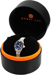 Cette montre Henry Jay se laisse admirer et désirer dès le premier coup d’œil et c’est la première chose que plusieurs utilisateurs recherchent lors du choix d’un tel gadget. Ce concepteur le sait car ce modèle se fait rapidement remarquer lorsqu’il est posé sur le bras d’un utilisateur. En effet, cette montre possède un boîtier d’une forme ronde en argent poli avec un cadran bleu électrique. Elle se mariera parfaitement avec n’importe quelle tenue et embellira votre bras. Les finitions de son cadran sont de couleur mattes avec un accent doré sur la lunette unidirectionnelle.
