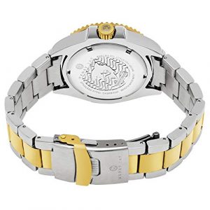 Vous remarquerez aussi des détails de bordures de type pièce de monnaie sur le cadran, ce qui apporte justement l’élégance recherchée sur une montre. La couleur argentée du bracelet se marie bien avec les bordures dorées du cadran et la couleur bleu qu’elle possède à l’intérieur. Les aiguilles aussi sont de couleurs dorées, avec les initiales du concepteur gravées sur le cadran. Si vous aimez tout ce qui est beau, cette montre pourra pleinement remplir cette fonction.