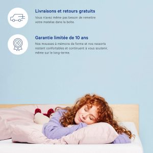 Ensuite, vous avez des entailles qui ont été réalisées dans la mousse de transition pour que vos épaules puissent s’enfoncer parfaitement dans le matelas. Et en enfin, vous avez une couche de soutien durable en mousse polyuréthane qui stabilise tout l’ensemble de votre corps lorsque vous dormez. Grâce à tous ces éléments ce matelas vous offre le confort que vous ne verrez pas sur un autre matelas.