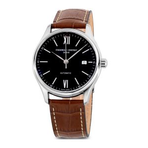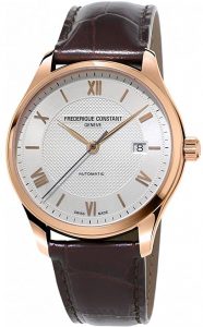 La montre Frédérique Constant Classics automatique est une montre au cadran argenté et au bracelet cuir marron. Elle saura vous séduire de par sa précision et sa beauté. Cette montre est animée par un mouvement automatique FC 303 de fabrication Suisse et allie à la fois fiabilité et raffinement. Elle est dotée d’un sublime boitier en acier plaqué or rose qui scintille aux rayons du soleil et s’accorde harmonieusement avec le cadran argenté. Les chiffres romains et index plaqués en or rose vont assurer une parfaite lisibilité tandis que le guichet date s’affirme à trois heures. Vu qu’elle est de qualité supérieure de par sa fabrication, elle saura vous donner la mesure du temps en toute circonstance. Son joli design contribuera nettement à la beauté de votre poignée lorsque vous la porterez. Elle sera votre nouveau garde-temps à forte personnalité.