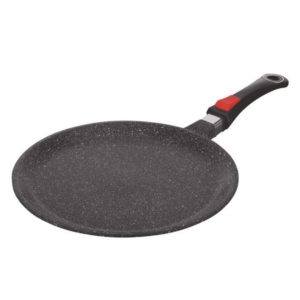 S’il faut définir cette poêle à crêpe indiction en quelques mots, on dirait qu’elle est pratique, solide et coûteuse. Tout d’abord, elle a un grand diamètre de 32 cm. C’est la garantie des crêpes larges et délicieuse, que vous pourrez garnir à volonté avec des charcuteries ou du chocolat. Sa structure en fonte d’aluminium est munie d’un revêtement anti-adhérent couleur pierre qui vous assure une conservation authentique du gout des aliments, sans que vous ayez besoin d’y ajouter des matières grasses. En outre, la fonte en aluminium vous garantit une résistance longue durée et une indéformabilité. Son fond en aluminium est compatible avec toutes les formes de réchauds et plaques de cuisine. Certes, son prix est considérablement élevé, mais on peut dire que cet accessoire en vaut la peine. Facile à nettoyer, elle dispose d’un manche amovible que vous pourrez enlever et remettre facilement, selon l’usage que vous voulez en faire.