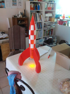 Il s’agit d’une fusée détachable constituée principalement de 7 pièces rouge et blanc qui, mises ensemble, donnent une fusée bicouleurs de Tintin. Très prisée par les tintinophiles, elle a déjà fait plus d’un heureux. Cette version 3D (3 dimensions) est à imprimer selon des dimensions précises afin d’obtenir la version finale comme présentée sous la forme éclatée. Tous les adeptes des Aventures de Tintin auront de quoi meubler leur temps en faisant jouer leur passion pour monter cette fusée Tintin à 3 dimensions.