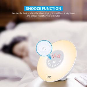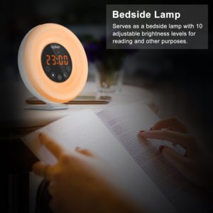 Il n’y rien de plus approprié que des sons de la nature pour vous assurer un réveil naturel. Conscients de cela, les fabricants du réveil simulateur d’aube Apiker ont intégré jusqu’à 6 sons naturels dans ses mélodies de réveil. Entendez pas là des simulations des chants d’oiseux, des ondes, des vagues de la mer et même des sons forestiers. C’est la garantie d’un réveil tout en douceur avec une lumière tamisée et adaptée à votre hypothalamus. Ce réveil tient sur un support anti dérapant et fonctionne comme lampe de chevet avec 11 niveaux de réglages avec lumière chaude pour une lecture sûre et sans efforts oculaires. Pour votre plus grand bonheur, il est disponible à très bon prix. Son design moderne et attractif rehaussera le décor de votre chambre. En revanche, bien qu’il soit fourni avec un manuel d’utilisation, sa manipulation reste encore difficile pour bon nombre de personnes.