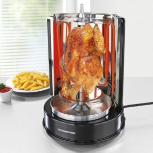 Intéressé par une tourne broche qui vous permet de rôtir vos viandes à une vitesse éclair ? Eh bien, sachez que vous pouvez le faire avec le Flyelf grill Vertical rotatif. Avec cet appareil, vous pouvez faire vos kebabs et brochettes en toute simplicité. Il a un volume de 31 L et ses dimensions ne sont pas gênantes. La broche tourne à une vitesse régulière autour de son axe et la chaleur se répand de façon homogène. Devenez un « Maestro » du barbecue avec cette tourne broche à foyer vertical. Que ce soit pour les viandes ou les légumes, vous en avez pour moins d’une heure de cuisson. Il coûte moins cher et est fourni avec un panel d’accessoires qui vous intéressera sans doute.
