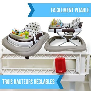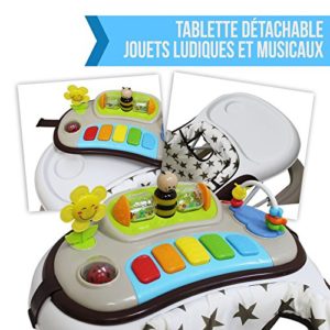Ce trotteur bébé est très recommandé, non seulement parce qu’il offre une superbe garantie à ses utilisateurs, mais aussi parce qu’il possède un service d’après-vente de confiance, qui sont là pour répondre aux besoins du consommateur. C’est un trotteur assez confortable pour tous les bébés, gros ou petit, votre enfant se sentira à l’aise dans cette trottinette. Vous n’aurez pas à vous inquiéter si votre enfant grandit, ce trotteur bébé possède une structure réglable qui vous permettra de l’adapter à chaque fois en fonction de la taille de votre bébé. Tout est prévu pour éveiller les sens de votre enfant et de le distraire au maximum, avec un plateau amovible comportant plusieurs jeux très intéressants, couplé à des petits sons musicaux que votre bébé va aimer. En dépit de sa taille un peu volumineuse, et des roues arrières bloquées en unidirectionnelle, c’est un trotteur qui convient à tous les bébés.
