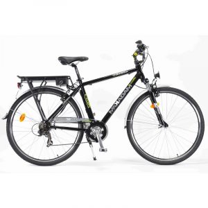 Le vélo 28 pouces E-BALADE Makadam est conçu pour vous faciliter le trajet lors de vos balades en vélo. Son cadre en alu mono poutre de 46 cm de hauteur assure une bonne liaison entre ses principaux éléments et est plus résistant à la corrosion. Sa fourche à suspension tête alu permet une meilleure direction du vélo et le freinage est optimal grâce à ses freins type V-Brake alu. Confortable et souple, il est donc léger, facile à manipuler et sa transmission se fait par sept vitesses par poignée tournante Shimano RS 36. Sa batterie Lithium-ion rechargeable 36V/10,4 Ah 375 W/H permet une autonomie d’environ 55 km. Ses jantes à double parois sont solides et assurent une parfaite stabilité de l’engin sur la route. Doté d’un éclairage avec connexion sur batterie, il possède trois différents niveaux d’assistances au pédalage.