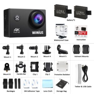 Le plus gros problème lorsqu’on reçoit une caméra, c’est de devoir encore aller sur internet chercher tous les accessoires compatibles afin de mieux travailler avec cet appareil. A cet effet, le fabricant a compris qu’il n’est pas pratique de laisser les accessoires à la charge du client, c’est pourquoi il a fait l’effort d’introduire tous les accessoires de ce Wimius q1 dans le coffret de livraison. Ainsi, vous avez la possibilité de fixer votre cameras sur différentes places, puisque dans le coffret vous allez trouver le gadget qui correspond à cet usage. Vous pouvez donc fixer votre cameras sur le bras, sur le dos, sur votre vélo, ou peu importe l’endroit, en fonction de ce que vous souhaitez filmer. C’est très bien pensé de la part de ce fabricant, surtout qu’il y a aussi à l’intérieur de ce coffret deux batteries pour vous permettre de ne pas être facilement à cours d’autonomie.